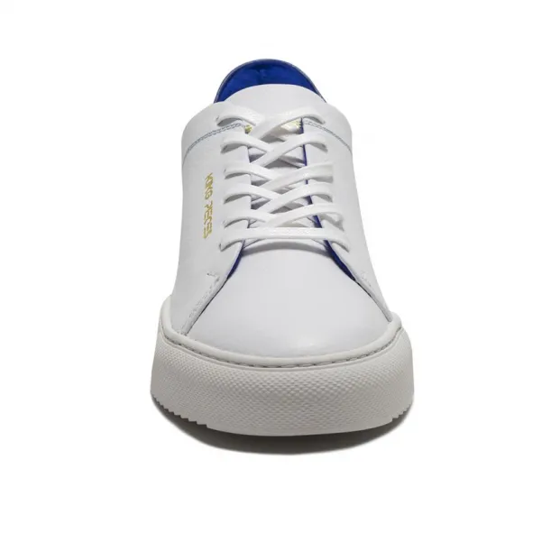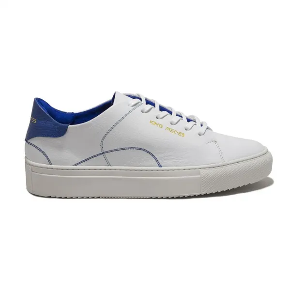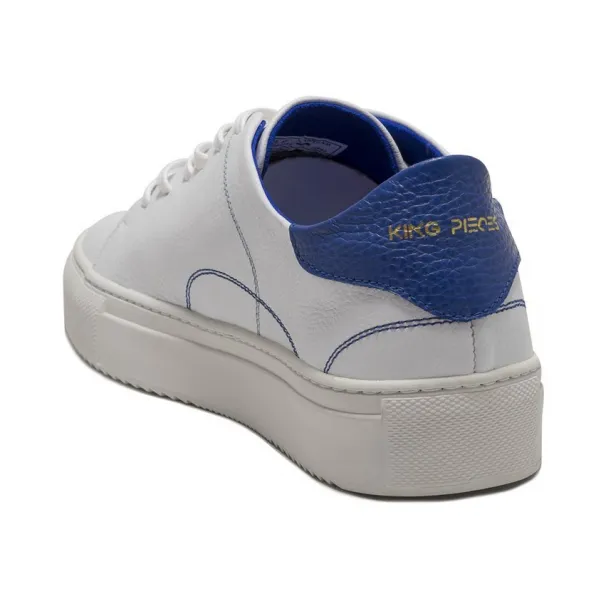 King Pieces presenta los tenis sneakers Lourdes White&Blue, un producto hecho a mano en Colombia, fabricado en cuero, forrado en el interior en cuero suave badana, cordón encerado y suela en caucho ligero.